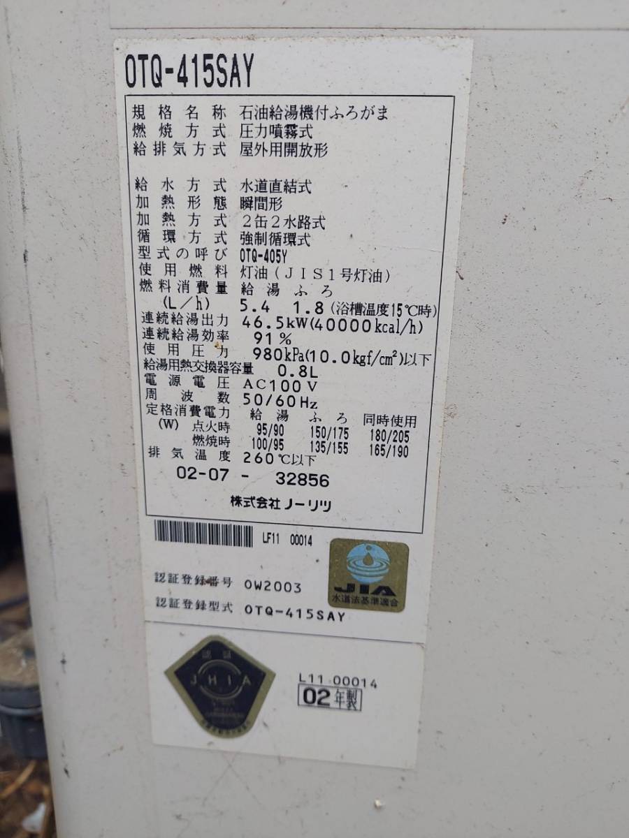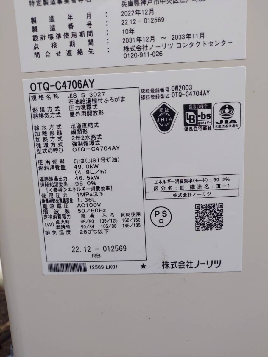 合志市 ノーリツOTQ-415SAY→ノーリツ石油給湯機付ふろがまOTQ-C4706AY 給湯器交換工事