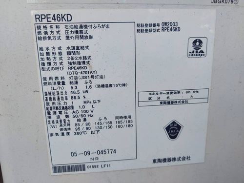 熊本市中央区 東陶機器石油給湯機付ふろがまRPE46KD→ノーリツ石油給湯機付ふろがまOTQ-4706SAY 給湯器交換工事
